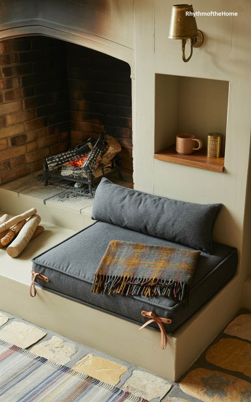 This simple and inviting scene perfectly captures the elemental comfort of a winter fire. A custom-cushioned seat, built directly into the fireplace hearth, provides the prime spot for soaking up the warmth from the glowing embers in the brick firebox. A classic plaid wool throw in muted autumnal tones is casually draped on the seat, ready to provide an extra layer of coziness. The design is minimal yet incredibly effective, celebrating the timeless pleasure of sitting beside a crackling fire on a cold and blustery day.