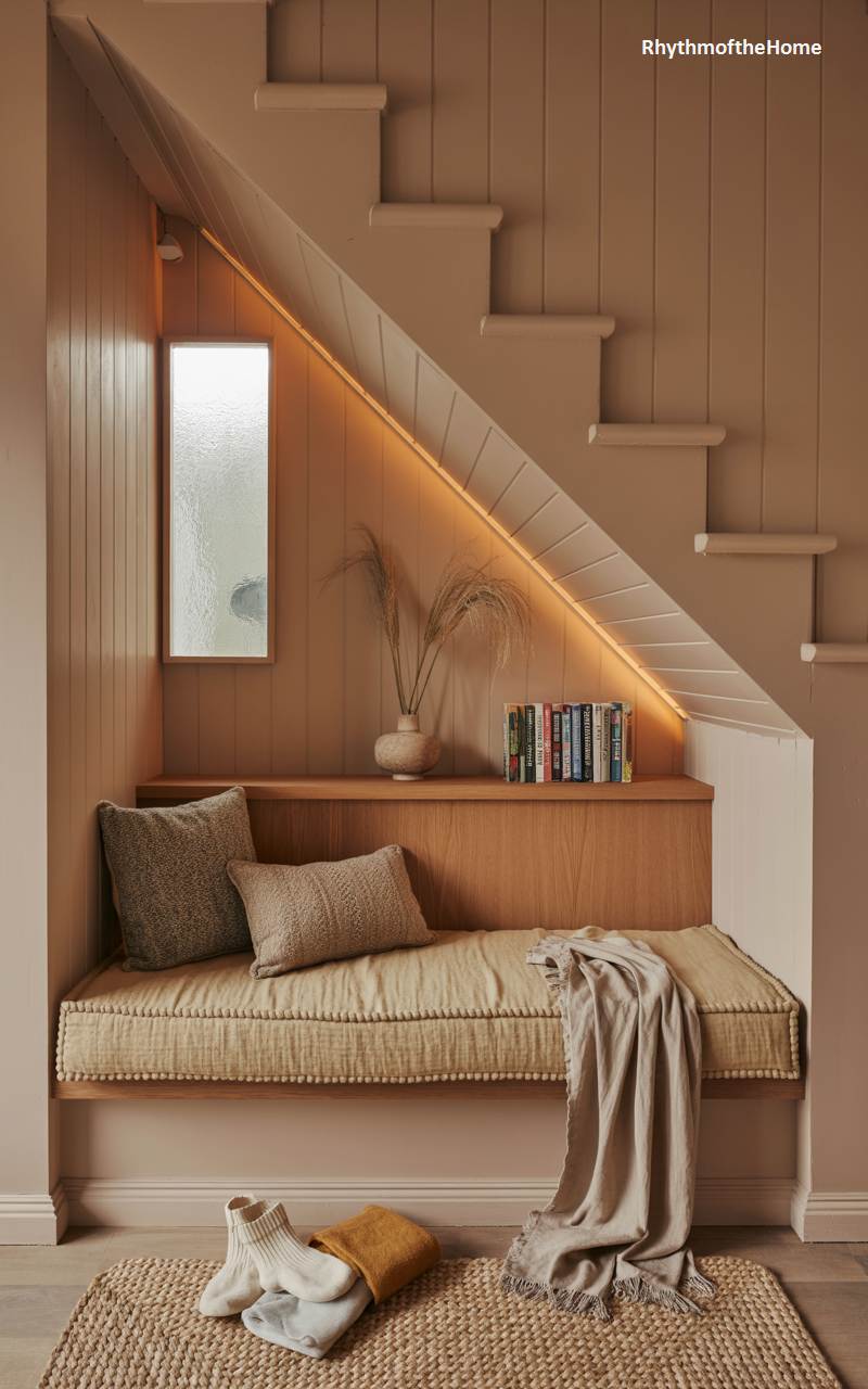 This clever and stylish design masterfully transforms the often-overlooked space beneath a staircase into a wonderfully cozy winter reading nook. A custom-built bench is fitted with a thick, comfortable cushion and an assortment of soft, textured pillows, creating an inviting spot to relax. Subtle, hidden LED strip lighting along the angle of the stairs casts a warm and welcoming glow without any harsh glare. The cohesive, neutral color palette and natural textures make this feel like a calm and secluded hideaway, perfect for escaping with a good book.