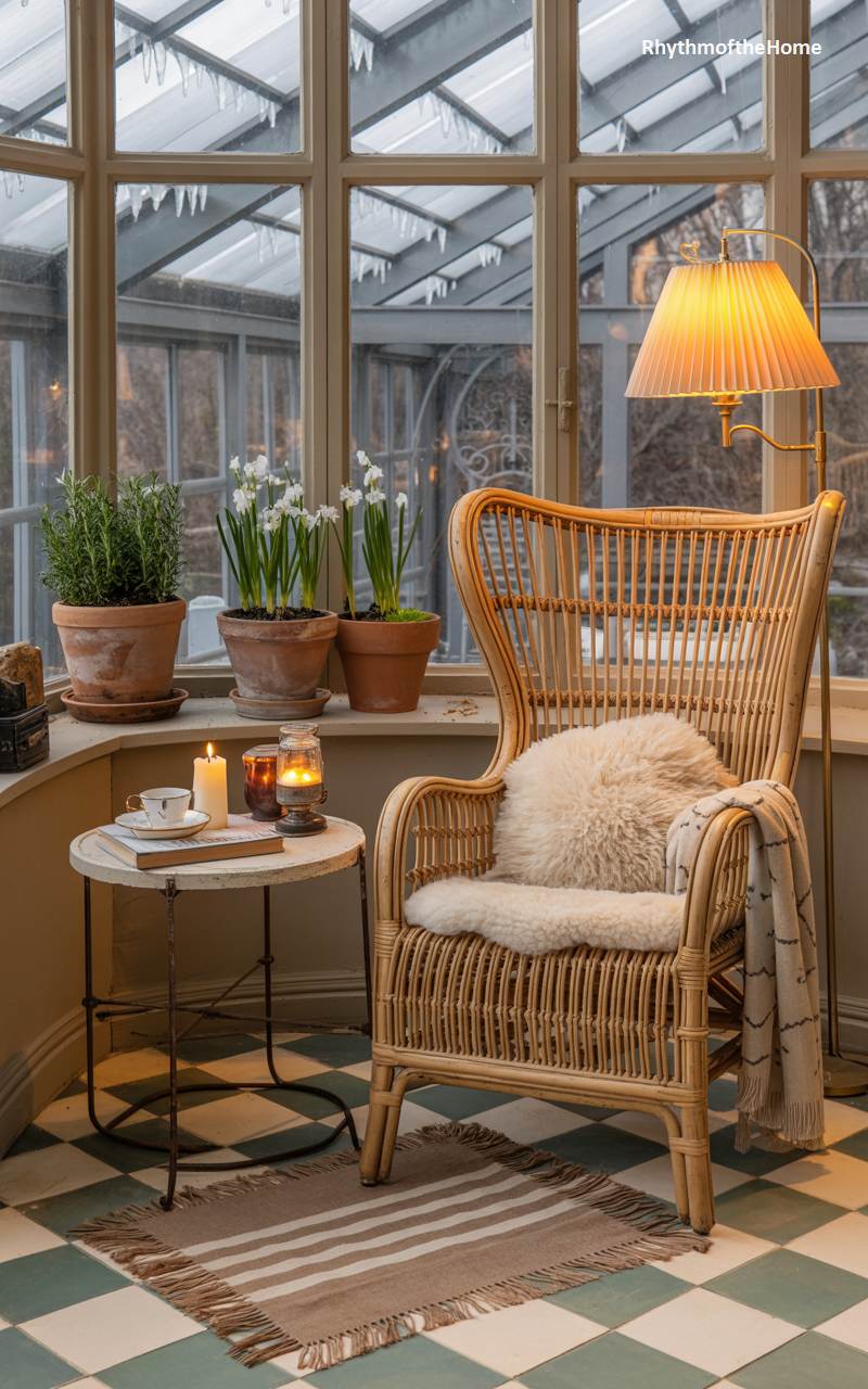 This bright and cheerful sunroom serves as a delightful oasis, offering a welcome dose of light and life during the darker winter months. A comfortable, high-backed rattan chair, made even cozier with a fluffy sheepskin cushion, provides the perfect vantage point to enjoy the views of the icy garden outside. Potted plants, including terracotta pots of fragrant, winter-blooming narcissus, bring vibrant greenery and a hint of spring’s promise indoors. The combination of natural materials, living plants, and warm lighting from a pleated floor lamp creates a wonderfully relaxing winter escape.