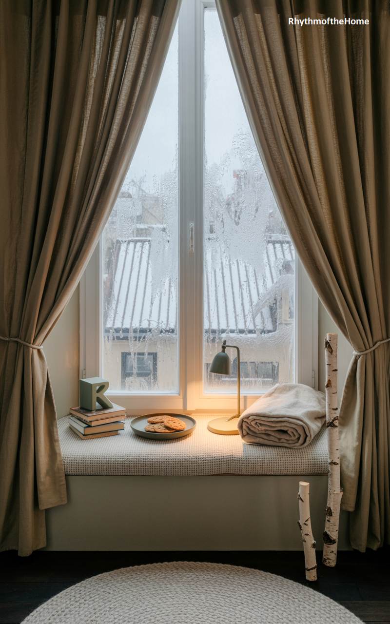 This simple yet inviting window seat offers a cozy perch from which to observe a snowy urban landscape. The window is framed by heavy, elegant, neutral-toned curtains that can be drawn to create an even cozier, more enclosed feeling. On the cushioned seat, a folded blanket, a small, modern lamp for reading, and a plate of cookies on a stack of books create a simple and welcoming vignette. Two small, decorative birch logs leaning against the wall add a subtle, rustic touch to this peaceful spot for enjoying a quiet moment.