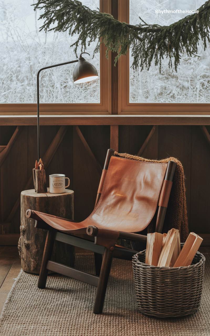 This inviting corner has a rugged, masculine, cabin-like feel, making it an ideal spot for a winter retreat. A handsome and comfortable sling chair, crafted from rich brown leather and a dark wood frame, is paired with a rustic side table made from a solid tree stump. A woven wicker basket is filled with split firewood, ready for the hearth. Above, a simple evergreen garland adds a touch of festive greenery, while the large windows provide a stunning backdrop of a snowy forest, enhancing the feeling of being warmly nestled in nature.