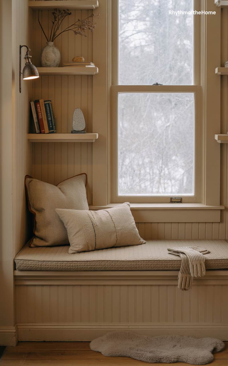 This beautifully designed window seat is a masterpiece of calm, understated winter elegance. The entire nook, including the beadboard paneling and the window trim, is painted in a single, warm, creamy beige hue, creating a serene and cohesive look. Soft, custom-fitted cushions and pillows in neutral, textured fabrics make it an exceptionally comfortable spot for quiet contemplation. A small, plush sheepskin rug on the hardwood floor below adds a final touch of cozy texture to this simple, sophisticated space designed for peaceful reflection.