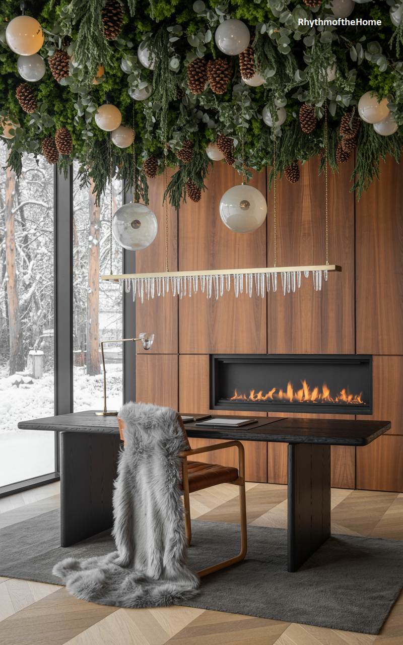 This home office redefines workspace luxury with its sleek, modern design and dramatic winter touches. Suspended from the ceiling is a breathtaking and artistic installation of evergreens, pinecones, and glass baubles, creating a festive canopy over the desk. A minimalist, linear gas fireplace is seamlessly integrated into a wall of rich, warm wood paneling, providing both warmth and ambiance. A gray faux fur throw draped over the leather office chair adds a final touch of cozy opulence, making this a truly inspiring place to work during the winter.
