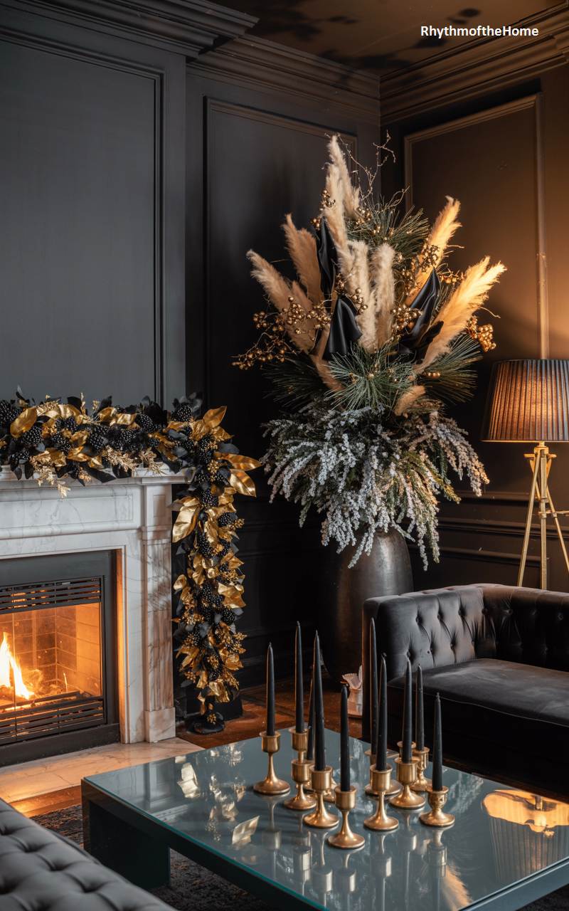 Embracing a bold and unconventional holiday aesthetic, this living room is a study in dramatic sophistication. The deep, matte black walls create a moody and intimate backdrop for the striking winter decor. A magnificent floral arrangement featuring pampas grass, pine, and dark foliage makes a powerful statement in a large vase. The white marble fireplace is draped with an elegant garland of black berries and metallic gold leaves, continuing the chic and luxurious theme. This space is a testament to a modern, glamorous, and daring approach to winter styling.