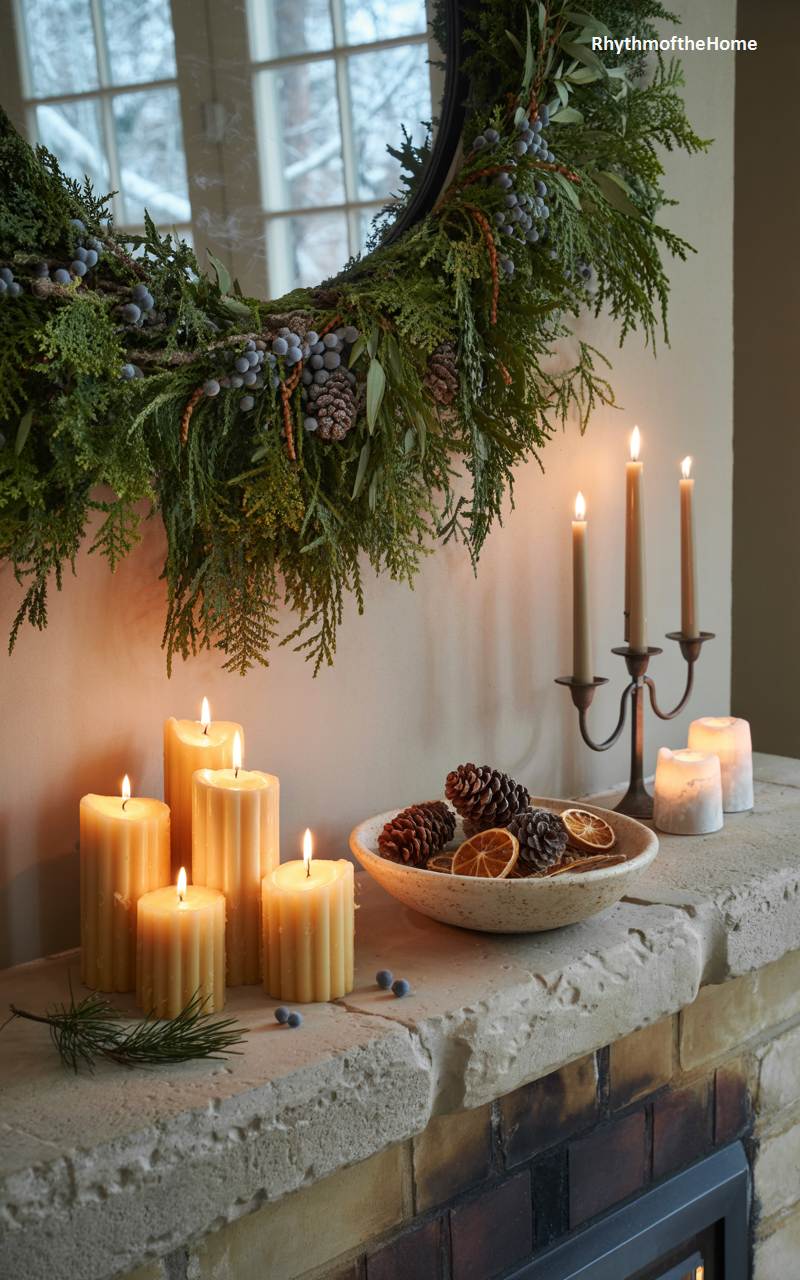 This beautifully styled mantelpiece is a perfect example of natural, rustic winter elegance. A lush, asymmetrical wreath made from fresh cedar boughs and juniper berries hangs artfully over the rough-hewn stone mantel. A collection of warm, honey-colored beeswax pillar candles of various heights and thicknesses is clustered together, casting a soft, inviting, and natural glow. A simple, handmade ceramic bowl holds a mix of pinecones and fragrant dried orange slices, completing a look that is organic, textural, and full of understated beauty.