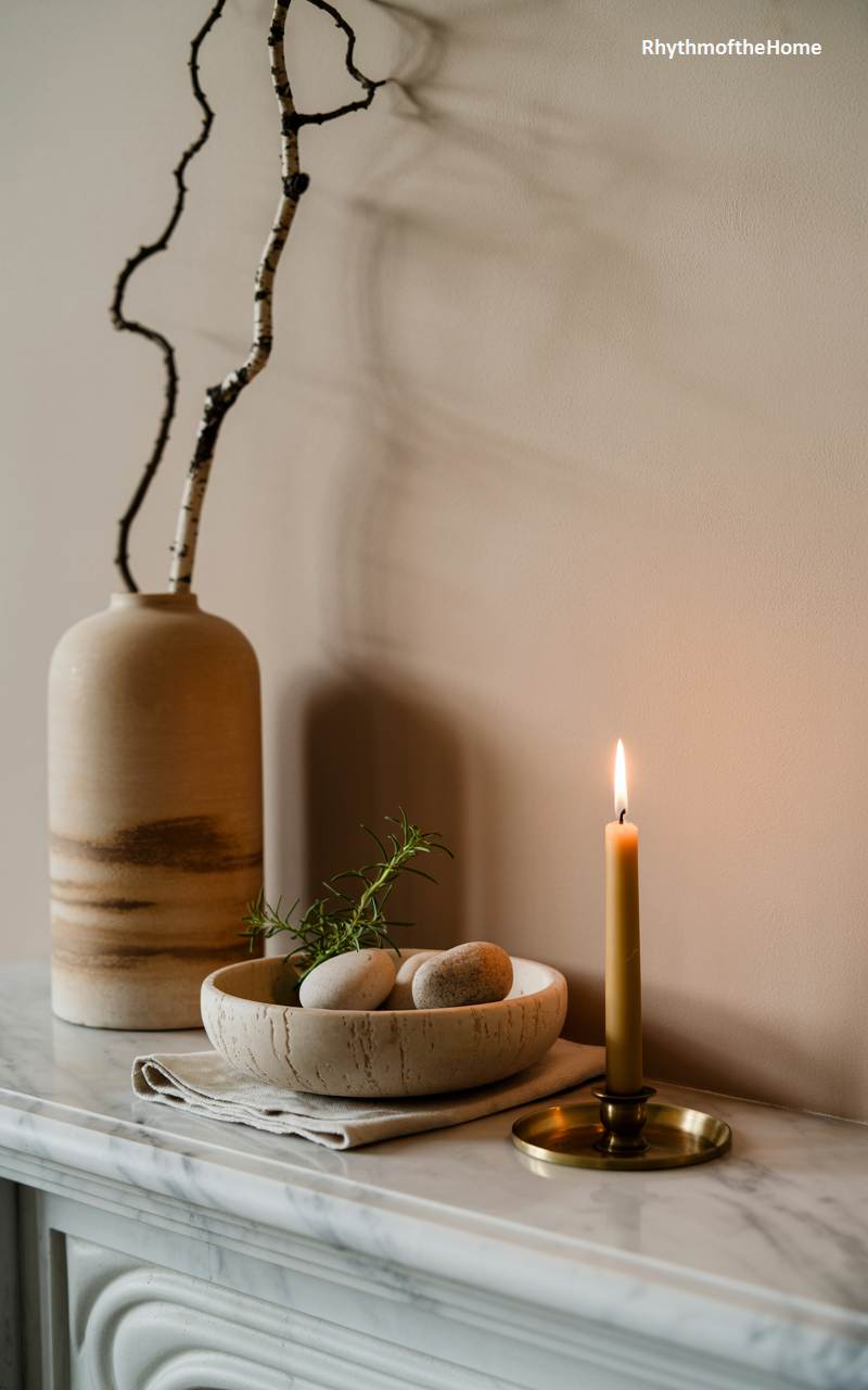 This image beautifully captures a moment of pure, minimalist winter serenity. On a clean, white marble surface, a single, slender beeswax candle in a simple, elegant brass holder burns with a steady, warm flame. Nearby, a shallow stoneware bowl holds a few smooth river stones and a single, fresh sprig of rosemary. In the background, a tall, handmade ceramic vase contains a single, sculptural birch branch. The composition is quiet, balanced, and peaceful, serving as a tranquil meditation on the simple, natural beauty of the season.