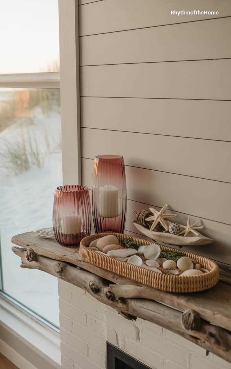 This unique and creative mantelpiece offers a beautiful coastal interpretation of winter decor, proving that seasonal style isn’t limited to pinecones and plaid. A large piece of weathered, sun-bleached driftwood serves as the mantel itself. Instead of traditional winter elements, it’s adorned with a curated collection of seashells, starfish, and woven trays, evoking the treasures of a winter beach walk. White pillar candles in rosy-pink glass hurricanes add a soft, warm glow, completing a look that is light, airy, and serenely beautiful.