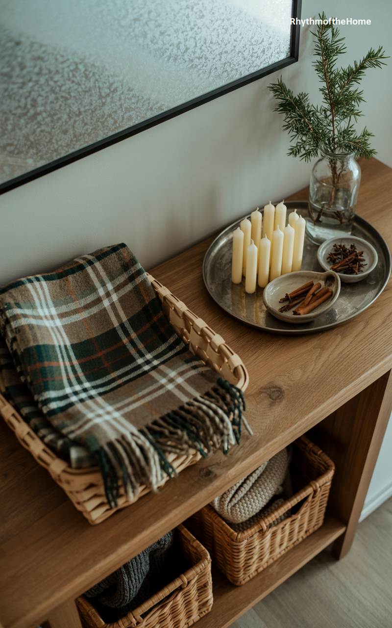This wooden console table is styled to be both beautiful and practical, offering a warm welcome during the winter months. A woven wicker basket holds a neatly folded plaid throw, ready to grab for extra warmth or to snuggle under upon arriving home. A large silver tray elegantly corrals a collection of simple white candles, along with small bowls filled with fragrant cinnamon sticks and star anise. Baskets on the lower shelf provide convenient and tidy storage for other winter essentials like hats and gloves.
