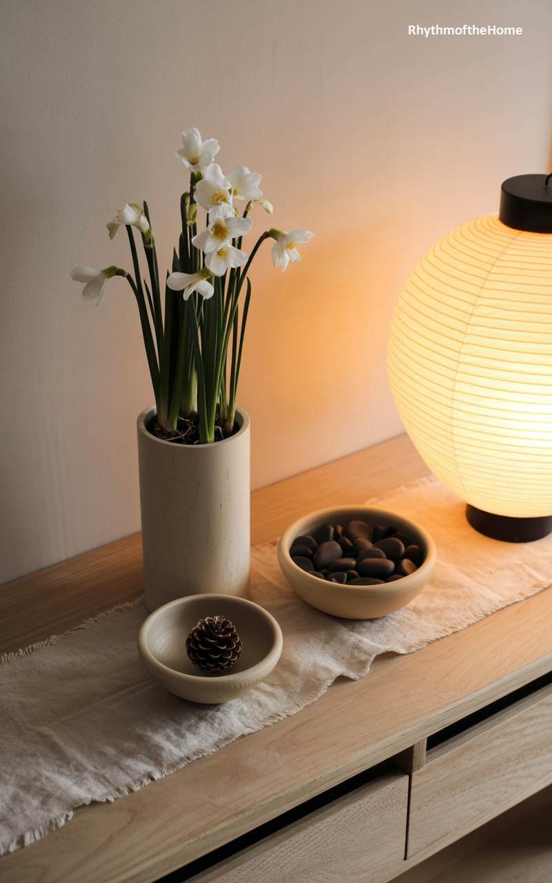 This tranquil scene embodies a minimalist and peaceful, Japanese-inspired approach to seasonal decor. A simple, light wood console table is the setting for a curated display: a tall, cylindrical pot holds blooming paperwhite narcissus, their delicate white flowers a symbol of hope and renewal in winter. A glowing paper andon-style lantern casts a soft, warm, and diffused light. Simple ceramic bowls containing smooth black stones and a single, perfect pinecone complete the composition, creating an aesthetic that is clean, calm, and deeply connected to nature’s quiet beauty.