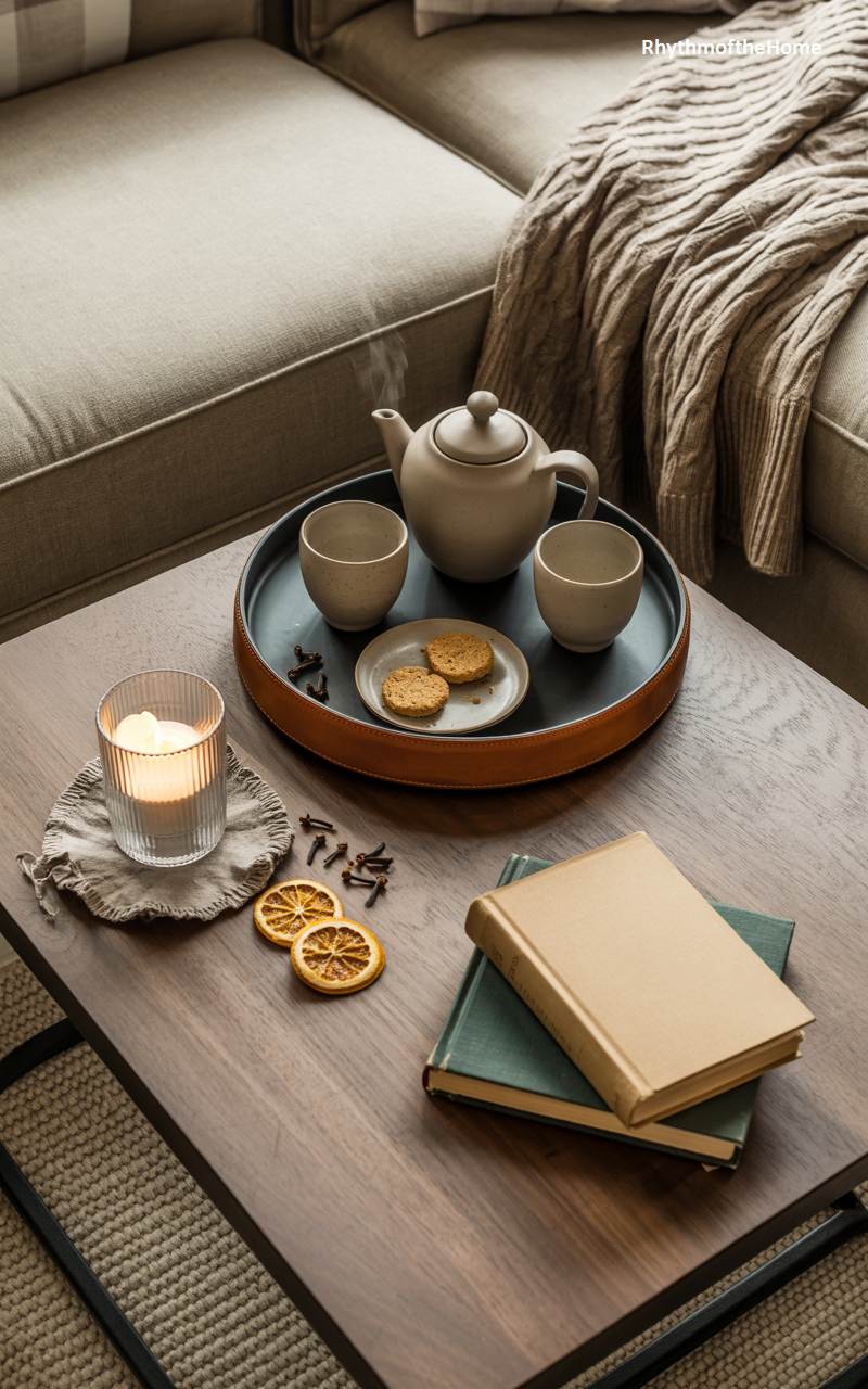 This inviting coffee table setting is the very picture of cozy winter indulgence and the Danish concept of “hygge.” A steaming ceramic teapot and two handleless cups rest on a handsome leather-trimmed tray, inviting a shared moment of warmth and conversation. A lit candle in a glass holder adds a soft, flickering glow. A couple of hardcover books suggest a leisurely afternoon of reading is in store. Scattered dried orange slices and whole cloves add a touch of seasonal color and their wonderfully evocative, spicy fragrance to the comforting scene.