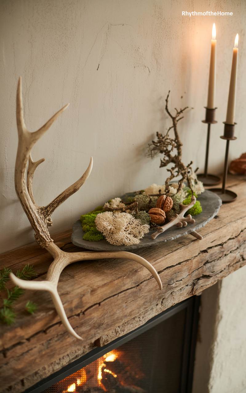 This rustic mantelpiece powerfully brings the rugged, untamed beauty of a winter forest indoors. A massive, rough-hewn wooden beam serves as the mantel shelf, its weathered texture adding immense character. The shelf is adorned with a dramatic, sculptural deer antler and a beautiful, natural arrangement of various types of moss, pale lichen, and walnuts, all artfully displayed on a long piece of slate. Two simple, tall candles in dark, forged-metal holders provide a warm, flickering light, completing this masculine and deeply organic tribute to nature.