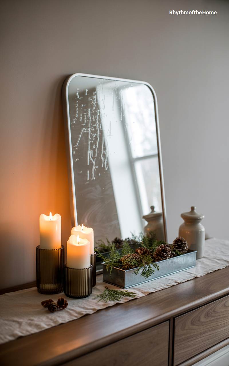 This elegant vignette creates a cozy and slightly mysterious winter mood on top of a wooden dresser. A trio of lit pillar candles, housed in modern, ribbed glass holders, casts a warm and inviting light. Behind them, a simple, round-cornered mirror has been artfully treated to look frosted, as if touched by icy breath on a cold morning, beautifully capturing the essence of the season. A long, galvanized metal trough filled with pinecones and fresh evergreen sprigs adds a touch of natural, rustic texture to the refined scene.