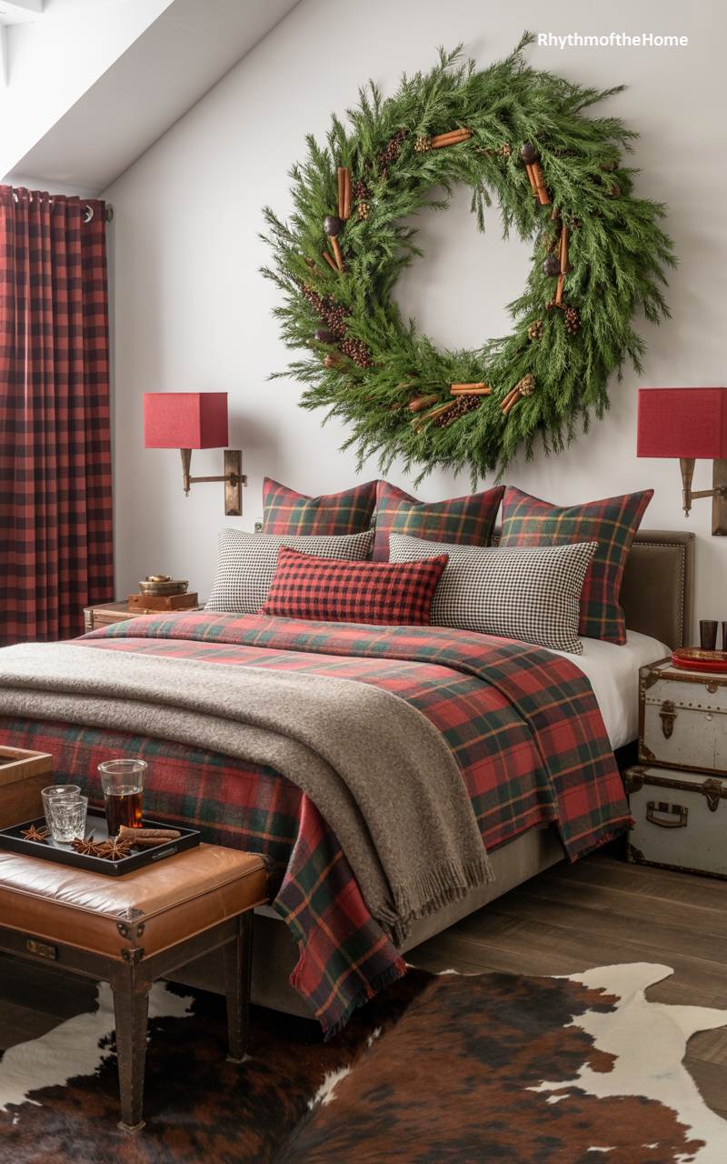 This bedroom is a perfect embodiment of a cozy, rustic winter escape. The bed becomes an inviting haven, layered with classic red and green tartan plaid bedding, houndstooth pillows, and a soft, earthy-toned throw blanket. The focal point is the magnificent, oversized wreath of fresh cedar and pine, studded with cinnamon sticks, hanging above the headboard, filling the room with a natural, festive fragrance. The use of vintage-style trunks as a bedside table adds a touch of rustic character, completing this warm and welcoming lodge-inspired look.