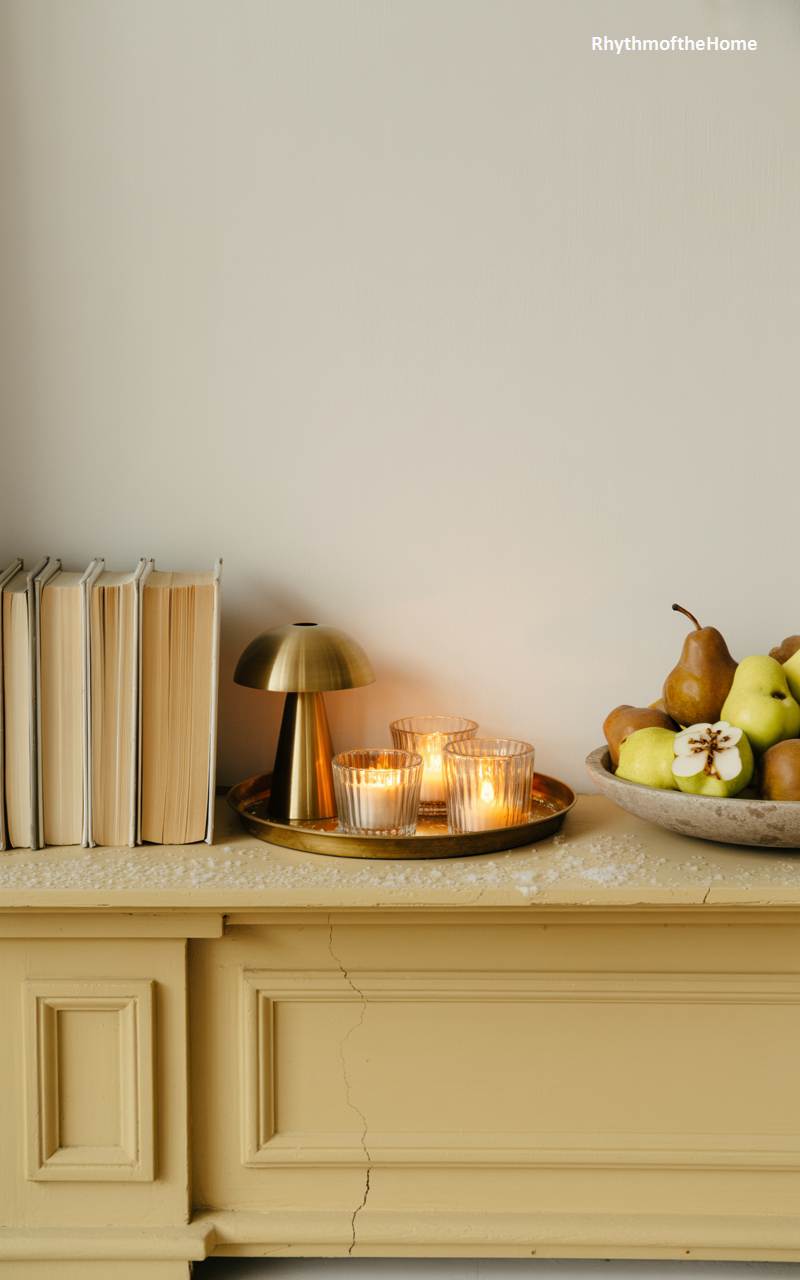This charming scene, arranged on a butter-yellow painted mantelpiece, is bathed in a warm, golden-hour light. A stack of old books, turned with their pages facing out, creates a neutral and beautifully textural element. A golden brass tray holds a small, mushroom-shaped lamp and several flickering tea lights in glass holders, casting a warm, metallic glow. A rustic wooden bowl filled with fresh pears adds a touch of natural, still-life beauty, transitioning from autumn to winter. The overall effect is cozy, literary, and full of gentle warmth.