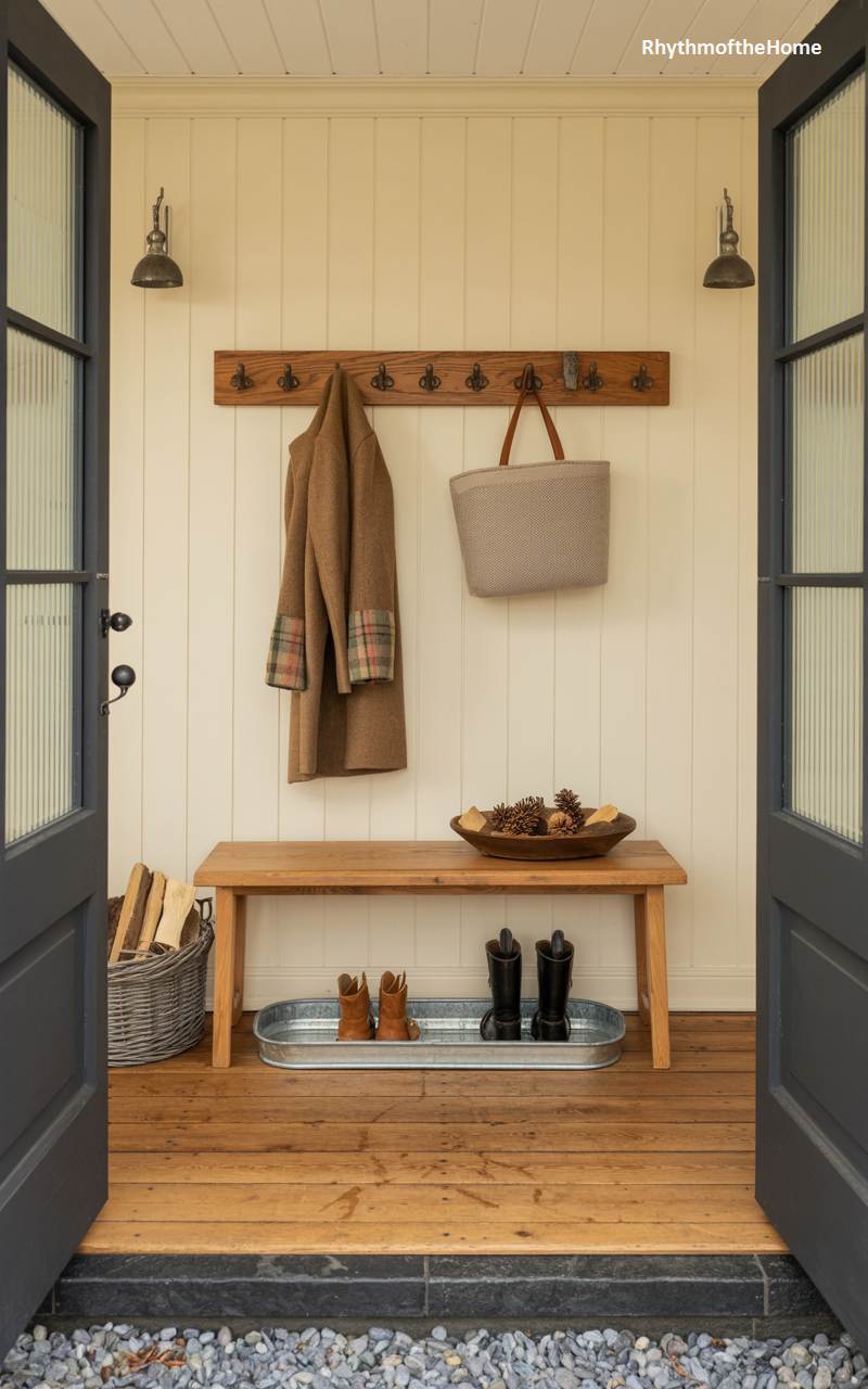 Viewed from just outside the open doors, this inviting entryway is perfectly poised to welcome guests in from the cold. A simple wooden bench sits against a clean backdrop of white vertical paneling. A classic wooden peg rack holds a warm wool coat and a simple tote bag. Below the bench, a galvanized metal tray provides a practical and rust-proof spot to neatly contain wet winter boots. A wicker basket filled with firewood and a wooden bowl of pinecones add rustic, natural touches to this clean and highly functional space.