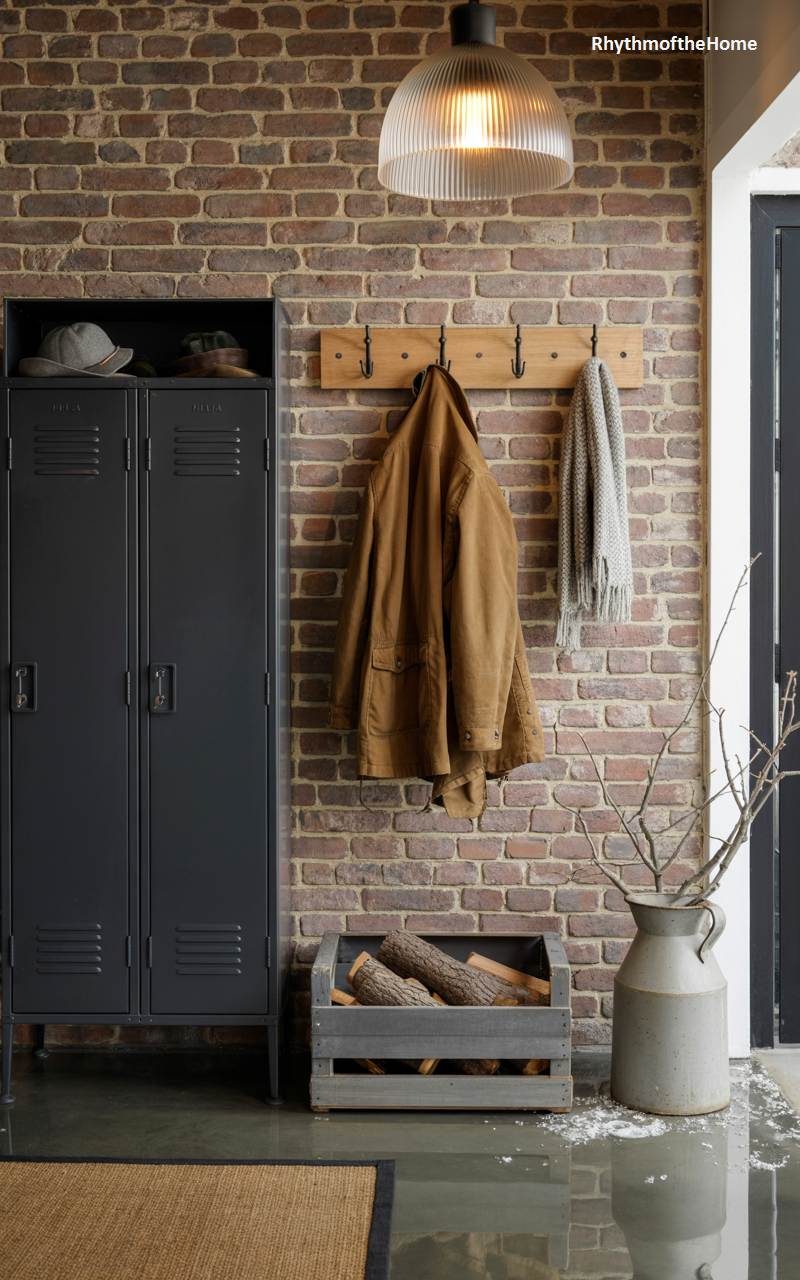 This entryway expertly combines rugged industrial elements with cozy winter touches for a unique and stylish look. A character-rich exposed brick wall provides a warm, textured backdrop for a dark gray metal locker and a simple wooden peg rack. A hardy brown canvas jacket and a soft gray scarf hang at the ready for the cold. A gray-washed wooden crate holds a supply of firewood, while a large stoneware milk jug contains an arrangement of bare branches, adding organic, rustic elements to the chic, urban-industrial aesthetic.