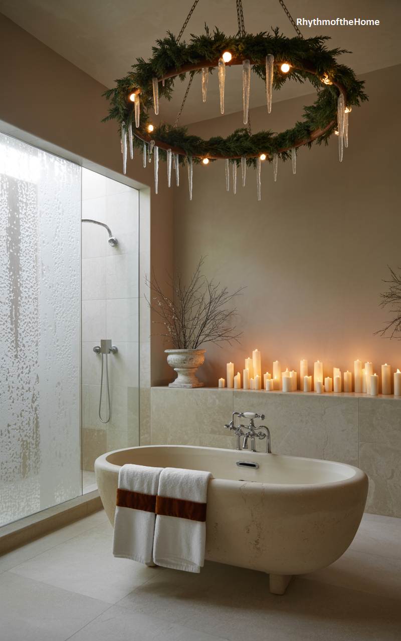This breathtaking bathroom is transformed into a sanctuary of ultimate winter indulgence and romance. A spectacular custom chandelier, formed from a large ring of evergreens and dripping with sparkling icicle lights, hangs dramatically above a freestanding stone bathtub. A wide ledge running behind the tub is completely filled with dozens of lit white pillar candles, creating a stunning wall of warm, flickering light. It’s a dramatic, opulent, and incredibly luxurious space designed for a deeply restorative and magical winter soak.
