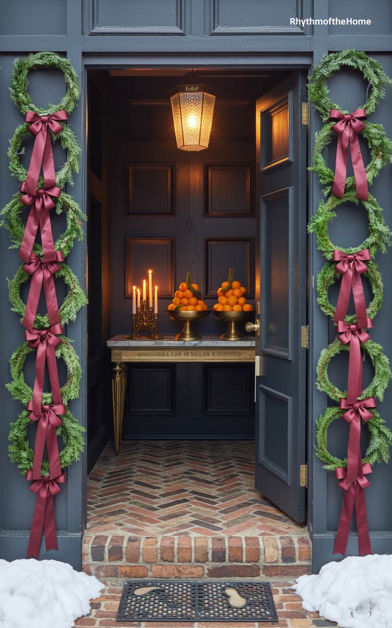 This magnificent entryway makes a dramatic and deeply elegant first impression. The sophisticated backdrop of dark, paneled walls and a classic herringbone brick floor sets a stately tone. The doorway is spectacularly flanked by two tall, vertical columns composed of stacked evergreen wreaths, all tied together with beautiful, flowing dusty rose ribbons. Just inside, a gilded console table holds ornate candelabras and two large brass bowls overflowing with fresh clementines, adding a vibrant pop of color and a traditional, welcoming touch.