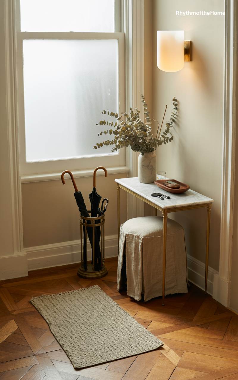 This small but perfectly appointed entryway corner is a picture of timeless, understated elegance. A delicate marble-topped console table with slender brass legs holds a simple vase of dried, silvery-green eucalyptus and a small ceramic dish for keys. A chic, linen-slipcovered stool is neatly tucked underneath. A classic brass umbrella stand is both a practical and stylish addition. The warm, intricately patterned parquet floor and soft, neutral wall color create a sophisticated and welcoming atmosphere for greeting winter guests.