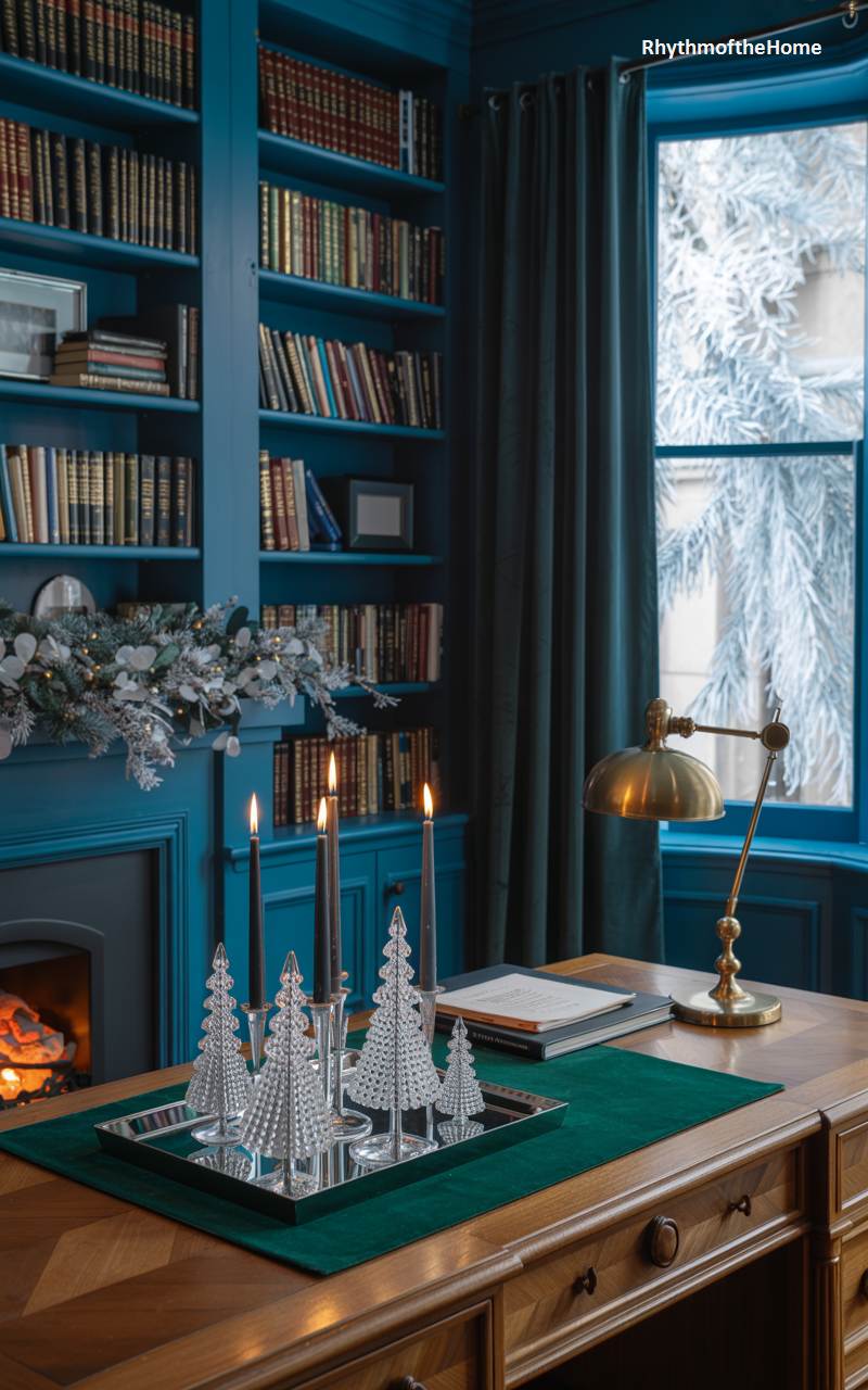 This handsome home office is a cozy and dignified retreat for work or reading during the winter. The walls and extensive built-in bookshelves are painted a deep, rich teal-blue, creating a dramatic and enveloping atmosphere. A fire glows warmly in the fireplace, adding both literal and figurative warmth and ambiance. On the large wooden desk, a mirrored tray displaying a collection of small, elegant glass Christmas trees adds a subtle and festive touch. The view of frost-covered tree branches outside creates a beautiful contrast with the warm, colorful interior.