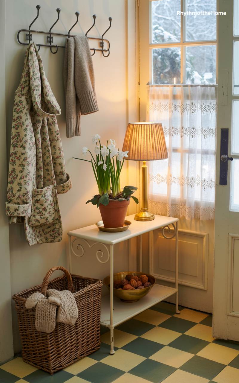This delightful entryway exudes a sweet and welcoming cottage charm. A simple, vintage-style white metal table holds a potted narcissus plant, its white blooms a cheerful promise of spring, alongside the warm glow of a small table lamp. A large wicker basket on the checkered floor below is filled with cozy, hand-knitted mittens. A pretty, floral-patterned quilted coat hanging on the wall adds a touch of nostalgic style. The classic green and cream checkered floor completes the friendly and unpretentious look, offering a truly cheerful winter welcome.