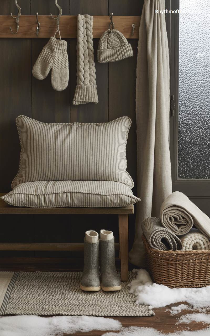 This simple yet evocative entryway vignette perfectly captures the essence of coming inside from the winter chill. A collection of cozy knitwear—a cabled scarf, mittens, and a hat—hangs from a wooden peg rack, ready for the next venture outdoors. Below, a cushioned bench offers a spot to remove winter boots. A wicker basket filled with rolled blankets promises warmth and comfort, while the frosted glass of the windowpane subtly reminds of the cold weather outside, making this small corner feel like a true haven.