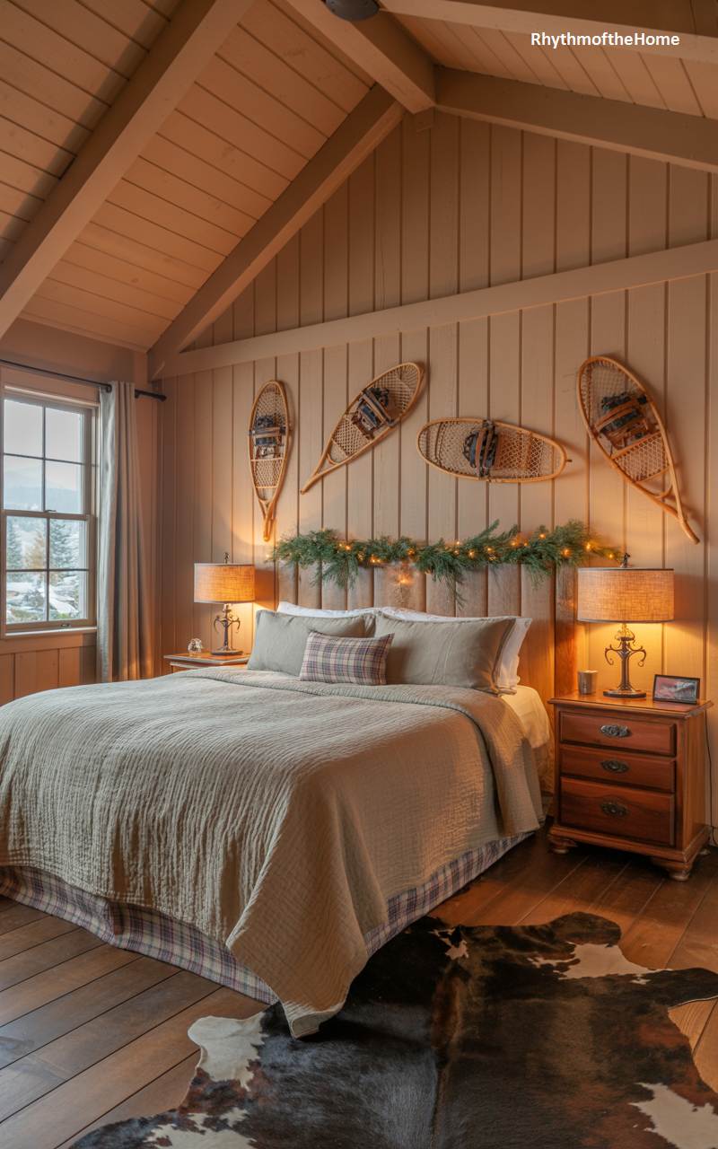 This bedroom perfectly captures the cozy and adventurous spirit of a rustic mountain ski lodge. The walls and dramatic vaulted ceiling are clad in warm, knotty wood paneling, creating an immersive, cabin-like feel. In a stroke of creative genius, a collection of vintage wooden snowshoes is artfully arranged on the wall above the bed, serving as unique and thematic decor. A simple garland of evergreens, intertwined with warm white lights, is draped below them, adding a festive touch. Plaid bedding and a cowhide rug complete the authentic winter retreat atmosphere.