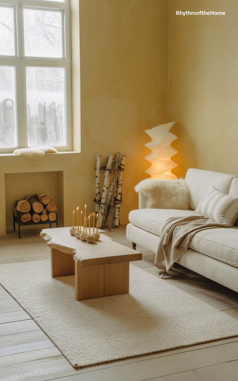 This living room is a serene and light-filled sanctuary, offering a cheerful antidote to winter grayness. The walls are painted a warm, sunny yellow, and a large window allows natural light to flood the space. A simple, contemporary white sofa is made extra cozy with a soft sheepskin throw and a folded blanket. The coffee table is a beautiful, organic piece of live-edge wood, holding a modern candelabra with tall, slender candles. Neatly stacked birch logs by the wall add a final rustic touch to this bright and calming space.