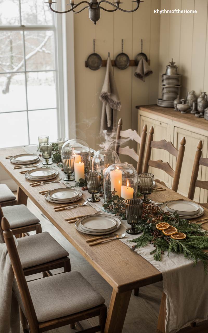 This dining setting beautifully demonstrates that when it comes to winter decor, simplicity can be incredibly powerful. A large, rustic stoneware crock, filled with an abundant and artful arrangement of fresh, fragrant pine branches, serves as a dramatic and entirely natural centerpiece for the simple, light-wood table. A few creamy beeswax pillar candles and simple, understated place settings are all that’s needed to complete the look. The focus remains squarely on the natural texture, form, and scent of the evergreens, creating a fresh and unfussy festive atmosphere.