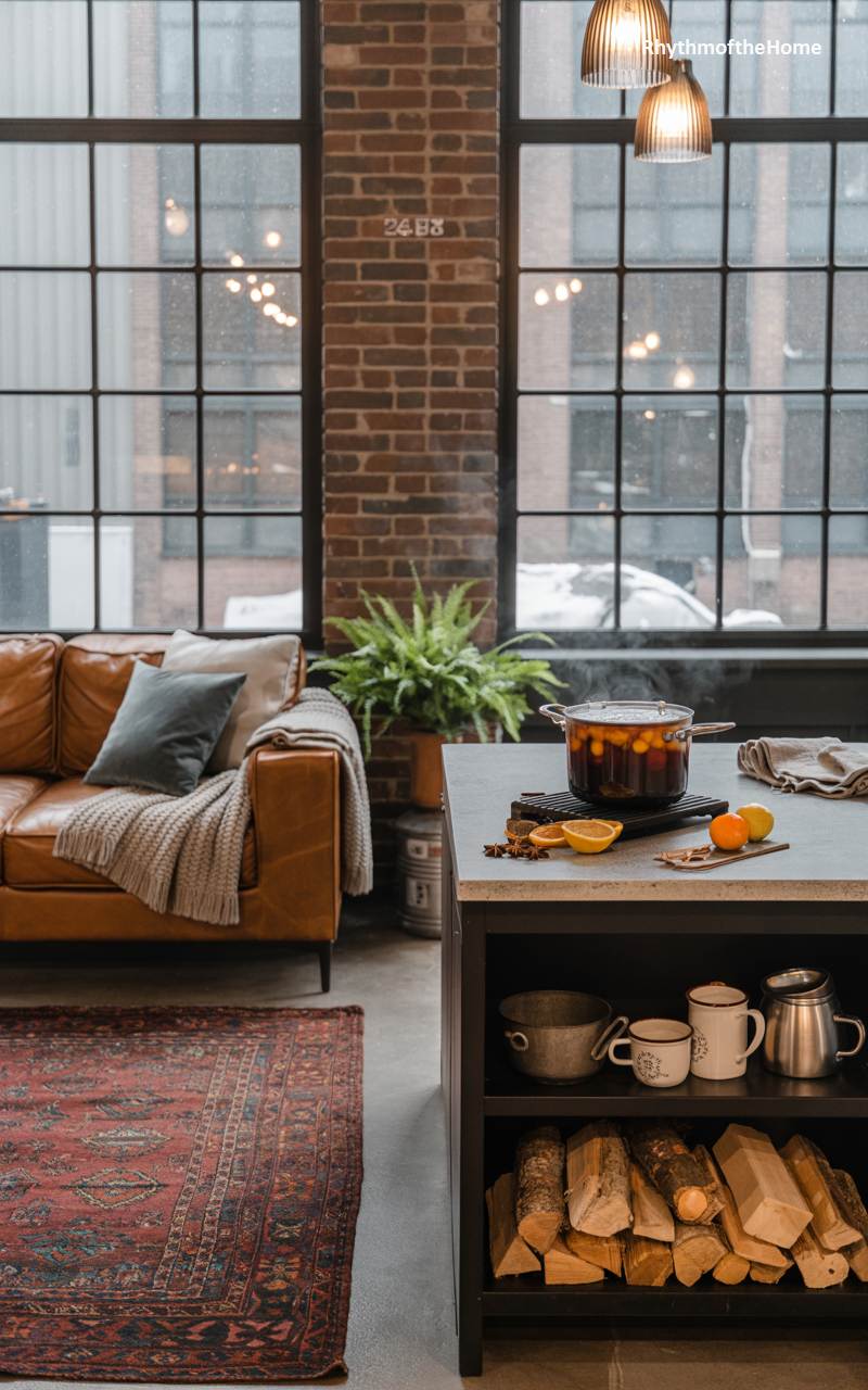 This spacious industrial loft is made cozy and inviting for winter through warm textures and the promise of a comforting beverage. A large pot of mulled wine, studded with orange slices and aromatic spices, steams away on the modern kitchen island, filling the large, open space with its festive and welcoming scent. In the background, a comfortable brown leather sofa is draped with a cozy throw, set against a backdrop of exposed brick and massive factory windows. A neat stack of firewood stored under the island adds to the rustic, urban-cabin ambiance.