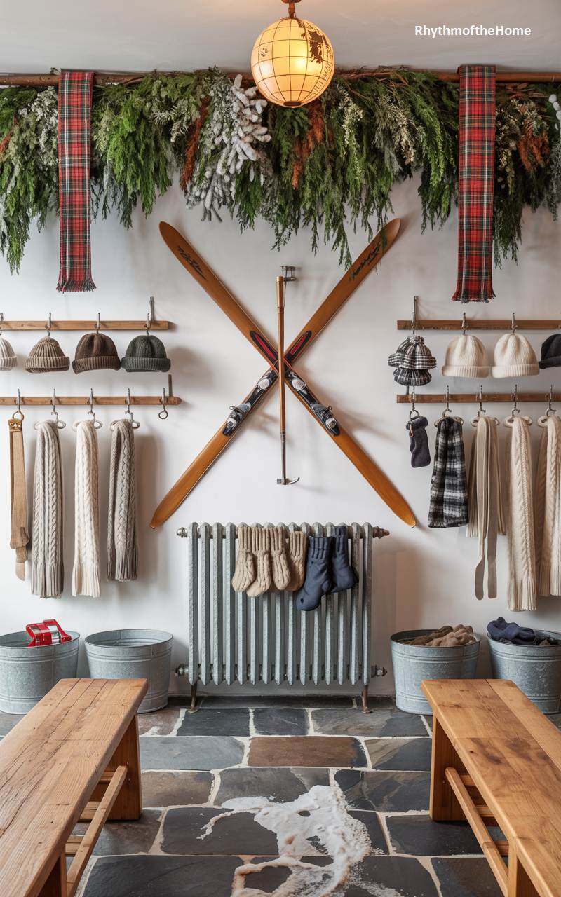 This characterful space is perfectly styled to evoke the fun and cozy atmosphere of a vintage ski lodge mudroom. A pair of classic wooden skis and a single ski pole are mounted on the wall in a bold “X” formation, creating an immediate and thematic focal point. A lush garland of frosted greenery hangs overhead. Walls of hooks hold a charming variety of knit hats, scarves, and mittens, while galvanized metal buckets and simple wooden benches provide practical and stylish storage and seating for gearing up or winding down from winter adventures.