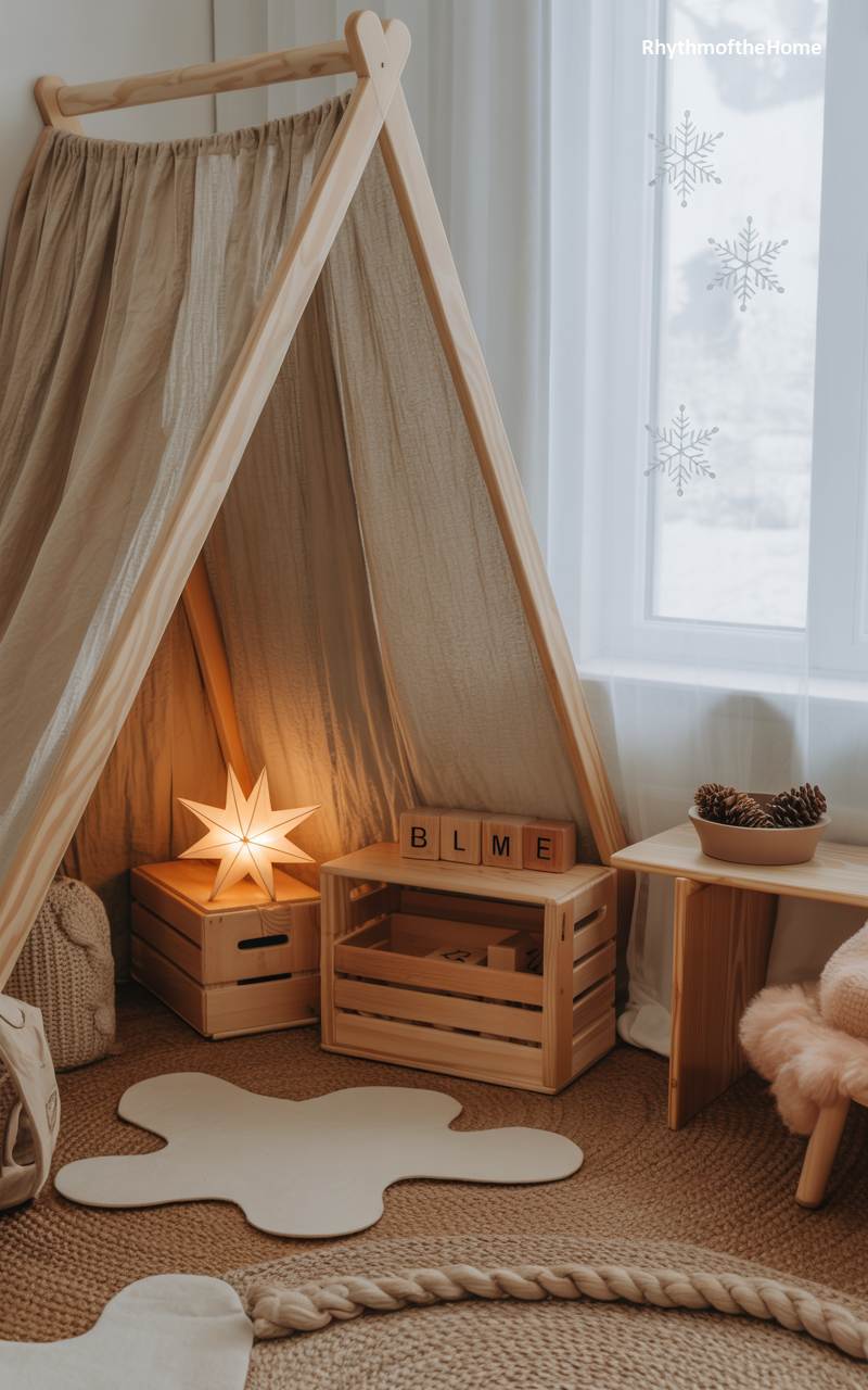This cozy corner of a child’s room is transformed into a magical and imaginative winter hideout. A simple, A-frame teepee made of natural wood and canvas creates a special, private space for play and dreams. Inside, a single, illuminated star-shaped light casts a warm and comforting glow, perfect for storytelling. Simple wooden crates are used as both storage and furniture. The overall palette of neutral colors and natural materials like wood and jute creates a calm, gentle, and inspiring atmosphere for quiet winter play.