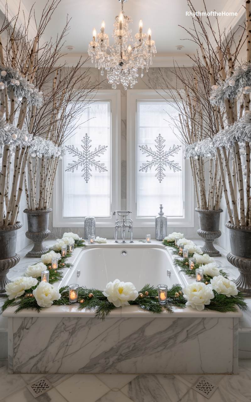 This magnificent bathroom is a vision of opulent winter glamour, fit for royalty. The entire space is clad in luxurious white and gray marble, which provides a stunning backdrop for the sparkling crystal chandelier. The grand, built-in bathtub is surrounded by a lush garland of fresh evergreens and large, perfect white peonies. Flanking the windows, which feature elegant silver snowflake decals, are two large urns holding dramatic arrangements of bare birch branches and shimmering silver accents. It’s a breathtaking and utterly luxurious winter wonderland.