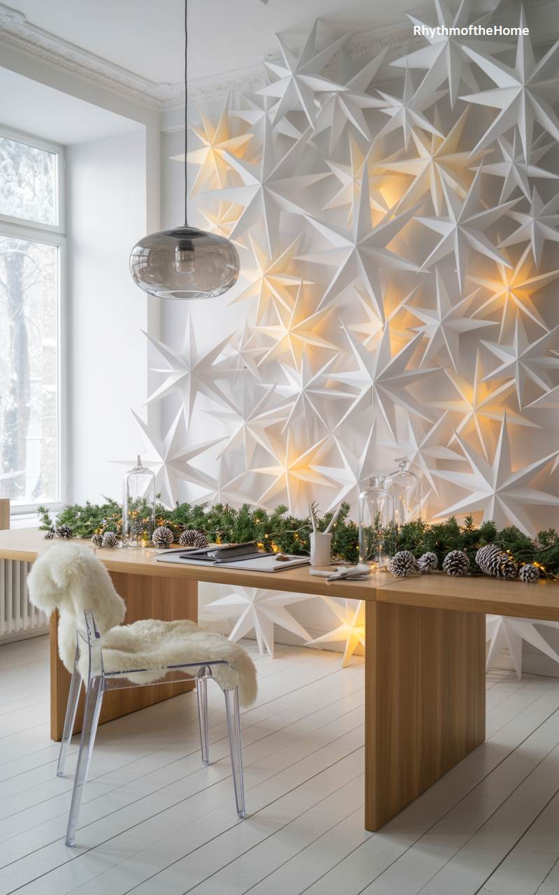 This workspace is bright, inspiring, and full of creative winter energy. The entire wall behind the desk has been transformed into a stunning, three-dimensional art installation composed of dozens of white paper stars in various sizes. Some of the stars are illuminated from within, creating a magical, textured, and glowing backdrop. A simple, clean-lined wooden desk is adorned with a festive green garland. A transparent acrylic “Ghost” chair, softened with a fluffy white sheepskin throw, adds a final touch of modern, playful chic.