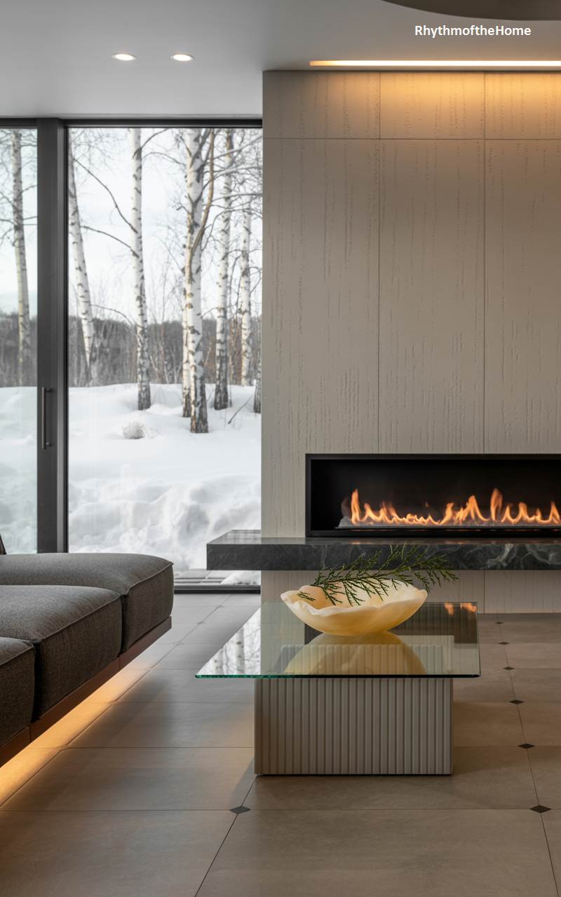 This living room showcases a sleek, sophisticated, and minimalist approach to winter coziness. A long, clean, linear gas fireplace provides a mesmerizing ribbon of flame, offering warmth and a dynamic focal point without any traditional clutter. Expansive, floor-to-ceiling windows offer a stunning and unobstructed view of a serene, snowy landscape dotted with beautiful white birch trees, effectively making the natural world the primary artwork in the room. The muted, sophisticated color palette of grays and creams allows the glowing fire and the winter vista to take center stage.