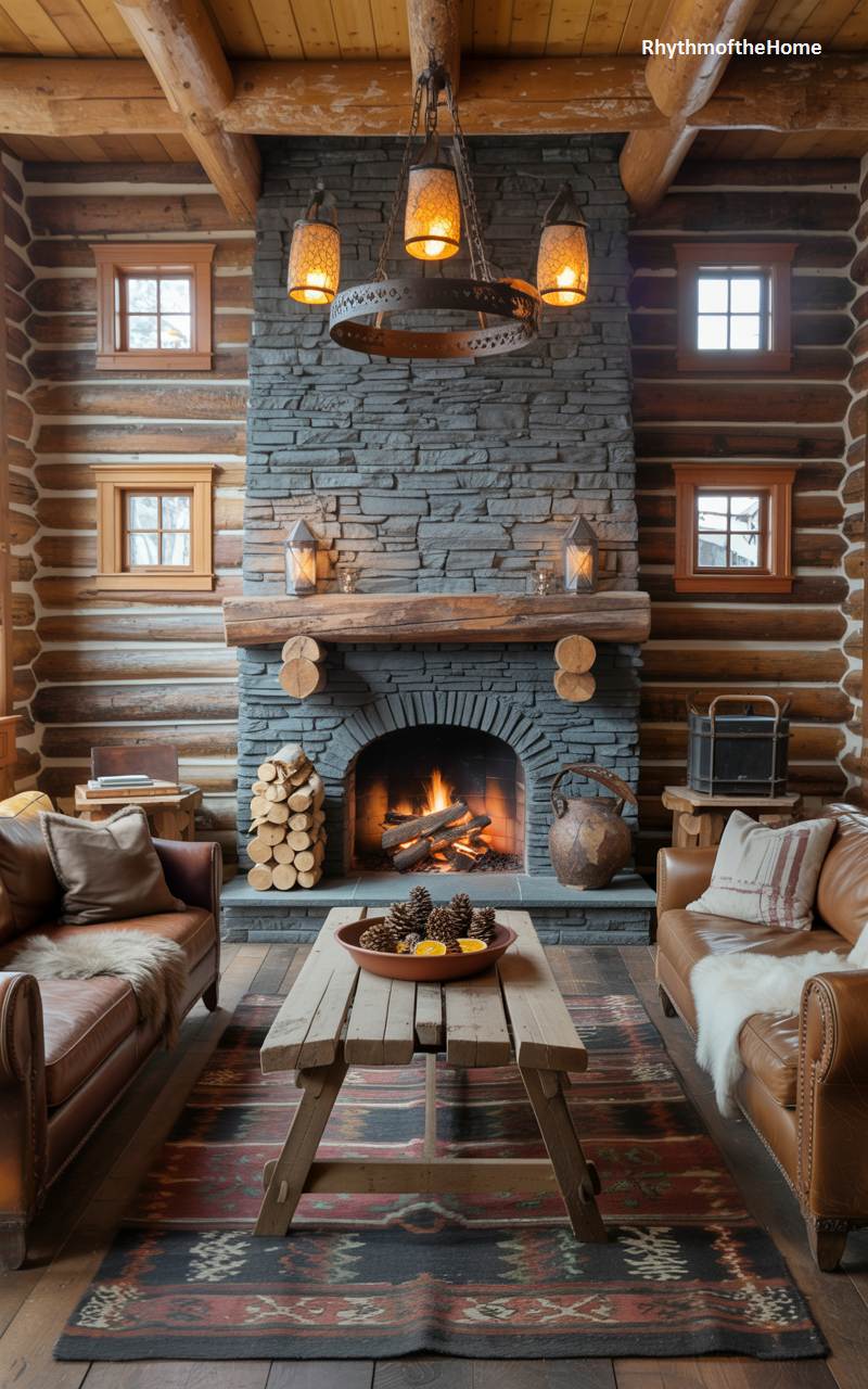 This living room is the absolute quintessence of a cozy, rustic log cabin retreat. The walls are constructed of massive, rounded logs, creating an authentic and deeply comforting atmosphere. A towering, majestic fireplace made of gray stacked stone dominates the room, with a warm fire crackling invitingly in its hearth. Two comfortable, well-loved brown leather sofas beckon you to sink in and relax. The entire space is suffused with the warm, golden glow from the fire and rustic iron light fixtures, creating the ultimate winter escape.
