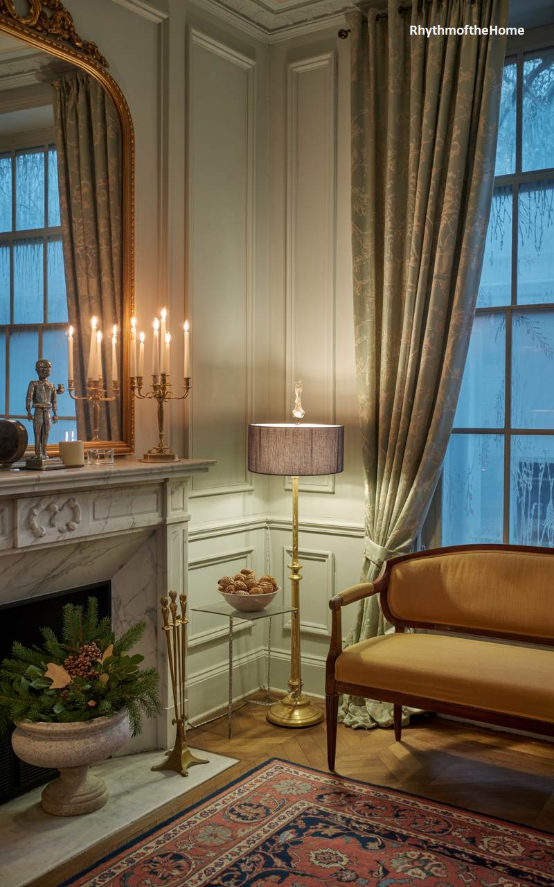 This beautiful living room exudes an aura of timeless elegance and quiet, old-world sophistication. A stunning white marble fireplace serves as the graceful focal point, its mantel adorned with an ornate, gilded mirror and a classic brass candelabra holding tall, flickering candles. The furniture is classic and refined, including a delicate settee and a floor lamp with a traditional silhouette. The lighting is soft and layered, creating a warm and deeply inviting atmosphere perfect for a civilized and cozy winter evening spent in good company.