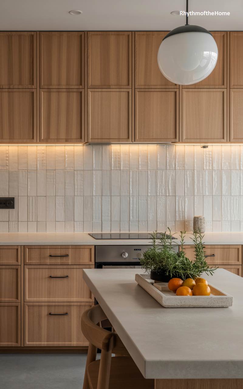 This kitchen beautifully combines clean, modern design with a warm, natural, and inviting feel. The light wood cabinetry features a simple, shaker-style design that feels both contemporary and timeless. A backsplash of glossy, handmade-style white tiles adds texture and reflects the light. On the solid surface island, a simple wooden tray holds a pot of fresh herbs and some clementines, bringing a touch of life, color, and fragrance into the space. The soft glow of under-cabinet lighting creates a welcoming ambiance, making this a warm and functional hub for the winter home.