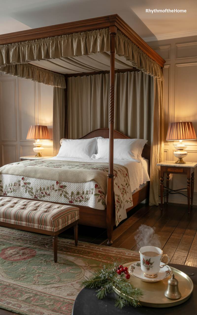 This elegant bedroom offers a classic and deeply cozy retreat from the winter world. A grand, dark wood four-poster bed, complete with a fabric canopy and curtains, creates a sense of enclosure, warmth, and intimacy. A beautiful quilt with a delicate floral or berry pattern adds a touch of traditional, feminine charm. In the foreground, a steaming cup of tea in a fine china cup rests on a tray, suggesting a leisurely and luxurious winter morning spent in bed. The warm lighting and rich wood tones create a deeply comforting and timeless atmosphere.