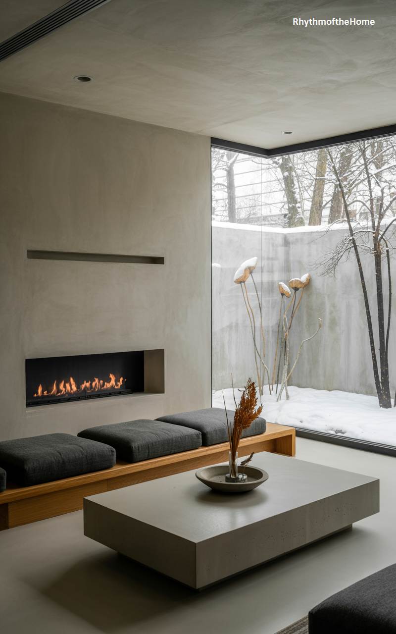 This living room is a serene and masterfully executed example of minimalist design. The walls are finished in a smooth, continuous concrete-like plaster, creating a calm and uniform backdrop. A sleek, black linear fireplace is set low into the wall, providing a warm and graphic focal point. A large corner window offers a tranquil view of a small, enclosed courtyard filled with snow, beautifully blurring the line between inside and out. The low-profile furniture and absence of clutter make this space a calm, contemplative sanctuary for the winter months.
