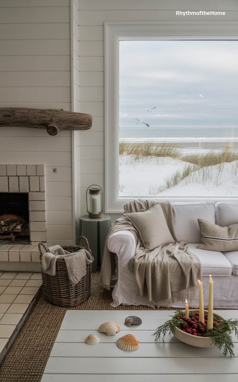 This serene living room perfectly captures the unique and quiet beauty of a coastal landscape in winter. A large picture window frames a peaceful view of snow-dusted dunes, waving grasses, and the gray-blue sea beyond. The interior is decorated in a light and airy coastal style, featuring a comfortable white slipcovered sofa and a mantel made from a piece of weathered driftwood. A simple bowl filled with fresh cranberries and evergreen sprigs on the coffee table adds a touch of seasonal color, while scattered seashells complete the authentic beach-house theme.
