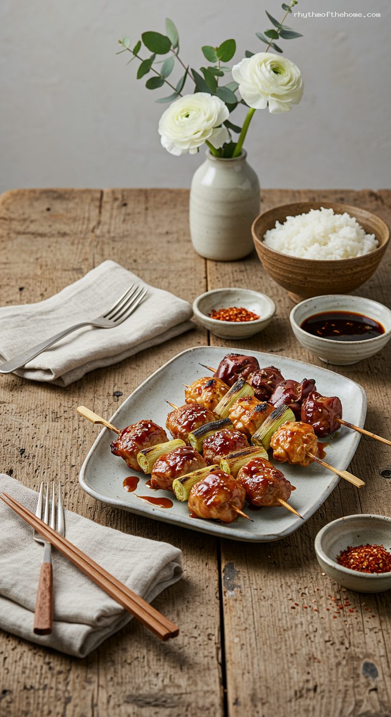 Make the tare up to 1 week ahead; refrigerate in a sealed jar (or freeze up to 3 months). Skewer chicken and tsukune up to 1 day ahead; cover and refrigerate. Leftover cooked skewers keep 3 days in the fridge; reheat in a 375°F oven or air fryer for 6–8 minutes until hot and edges re-crisp. Rice keeps 3–4 days; reheat with a sprinkle of water and cover to steam.