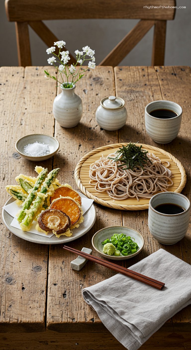 • Pantry: Dried soba noodles, nori, soy sauce, mirin, sugar, kombu, katsuobushi or instant dashi, cake or all-purpose flour, cornstarch, baking powder, kosher salt, neutral frying oil (canola/peanut), optional bottled mentsuyu.