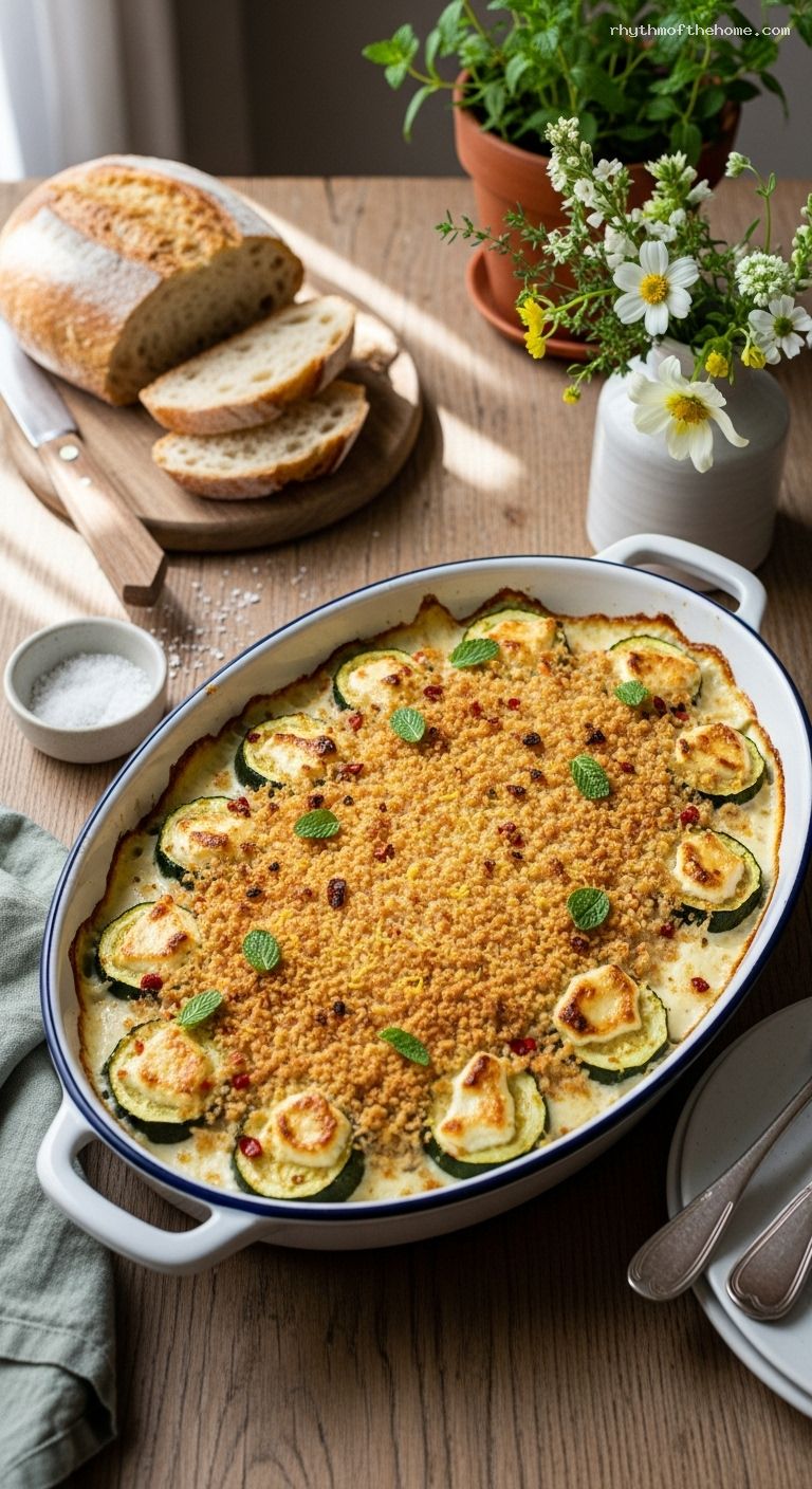 Cover the dish loosely with foil and bake for 15 minutes. Remove the foil and continue baking 15–20 minutes, until the gratin is bubbling around the edges and the breadcrumbs are deeply golden. Let rest 5–10 minutes to set. Finish with a drizzle of olive oil and a sprinkle of fresh mint. Serve warm.
